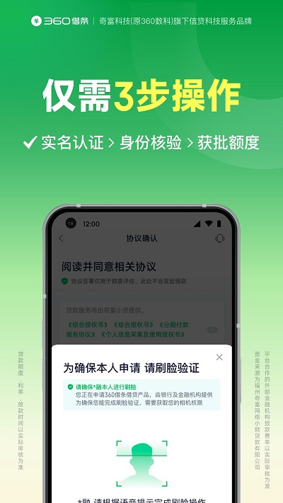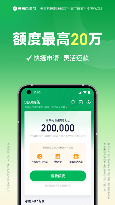 360借条是奇富科技旗下的信贷科技服务品牌,正规可靠,累计注册用户2亿。额度大、放款快、操作简单! 最高能借20万,年化利率(单利)7.2%起。为你轻松解决资金问题。